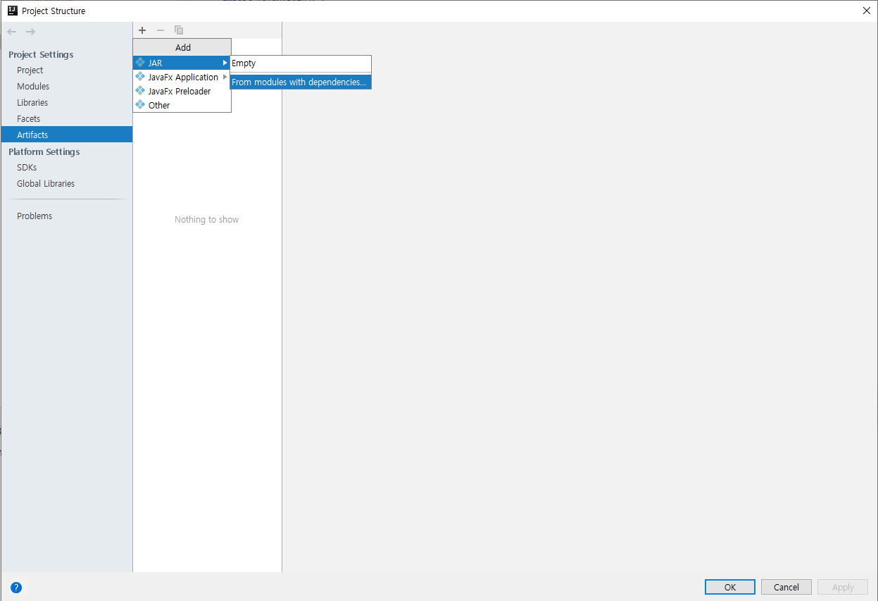 프로젝트 구성 창의 좌측 탭에서 Artifacts를 선택한 후 상단의 + 버튼을 클릭하고 Jar > From modules with dependencies 를 클릭합니다.