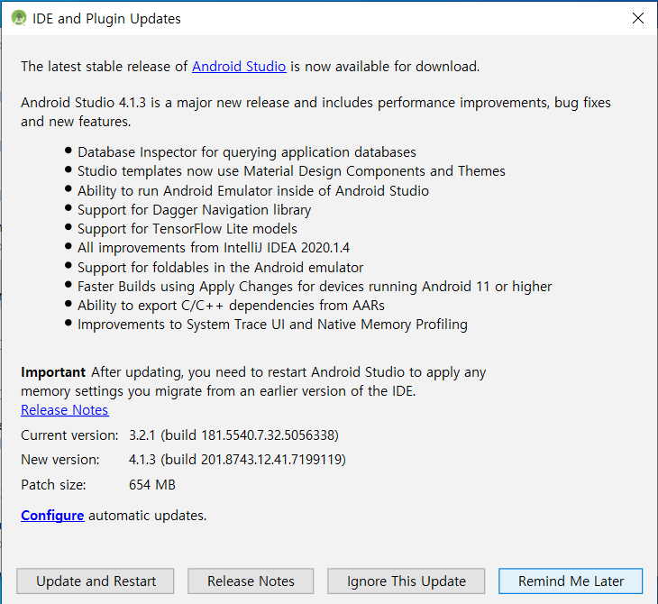 그러나 저는 상남자이므로 기존 3.2.1 버전 IDE를 2021년 3월에 출시한 4.1.3 버전으로 업데이트를 강행하였습니다.