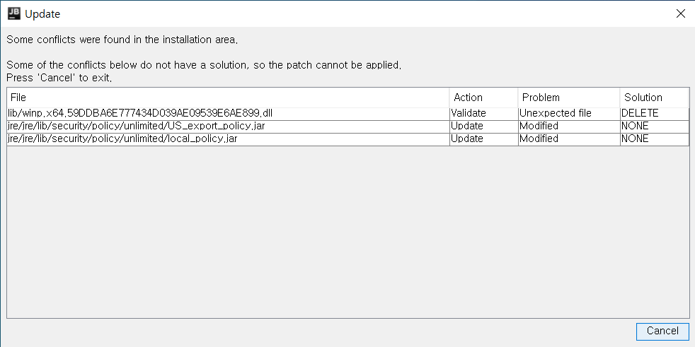 다행히도 Stack overflow에 같은 문제점을 호소하는 외궈분들이 계셨고, 솔루션은 심플했습니다. 같은 버전의 Zip Archive를 다운로드 받고 기존에 설치된 IDE 바이너리와 비교 후 똑같이 맞춰주면 된다고 합니다.