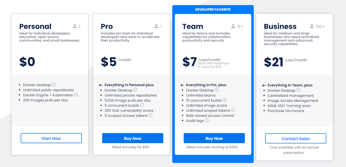 - Docker subscriptions now encompass four tiers of service: Personal, Pro, Team, and Business (a new tier of service). Each tier includes Docker Desktop.