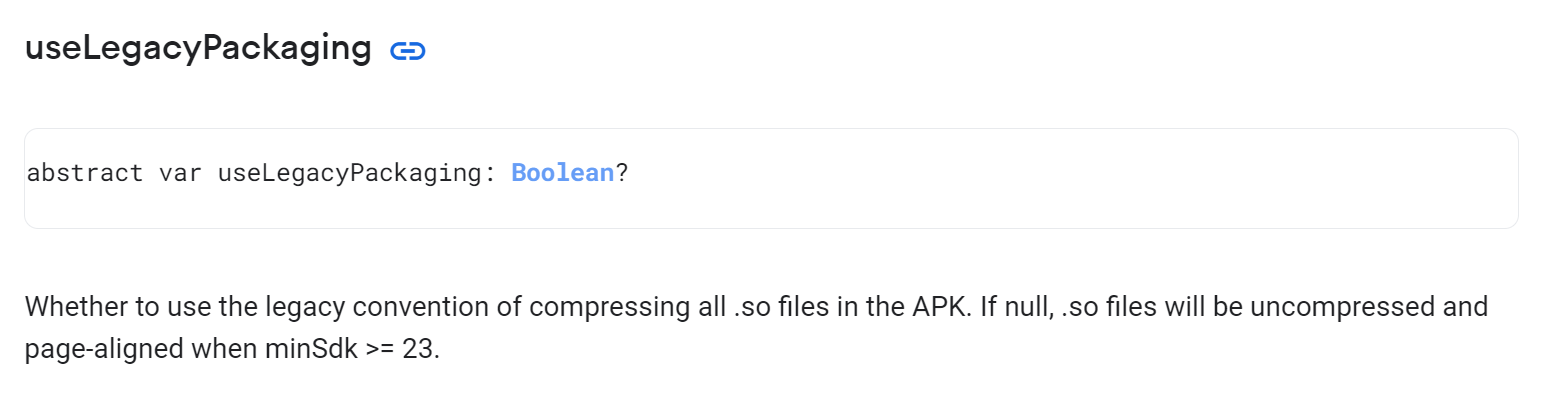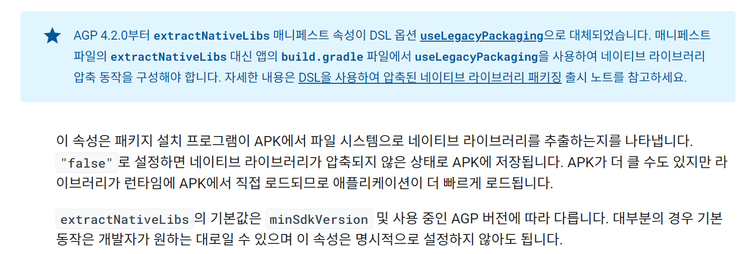 - https://developer.android.com/reference/tools/gradle-api/7.1/com/android/build/api/dsl/JniLibsPackagingOptions?hl=ko#uselegacypackaging